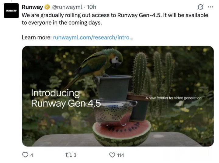 官方表示正在逐步开放Runway Gen-4.5的使用权限,未来几天内所有用户都能体验到。