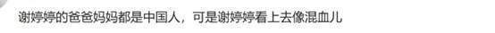 有网友留言表示:谢婷婷的爸爸妈妈都是中国人,可是谢婷婷看上去像混血儿。