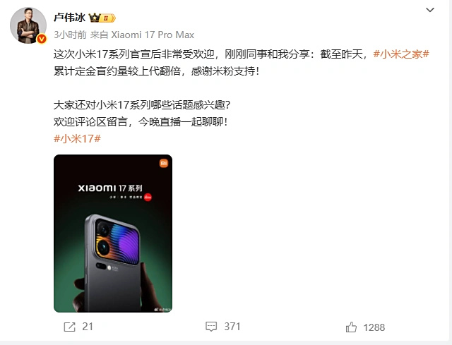 而今天,小米集团合伙人、总裁,手机部总裁,小米品牌总经理卢伟冰在微博表示:这次小米 17 系列官宣后非常受欢迎,刚刚同事和我分享:截至昨天,#小米之家#累计定金盲约量较上代翻倍!